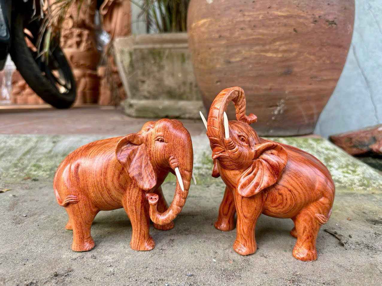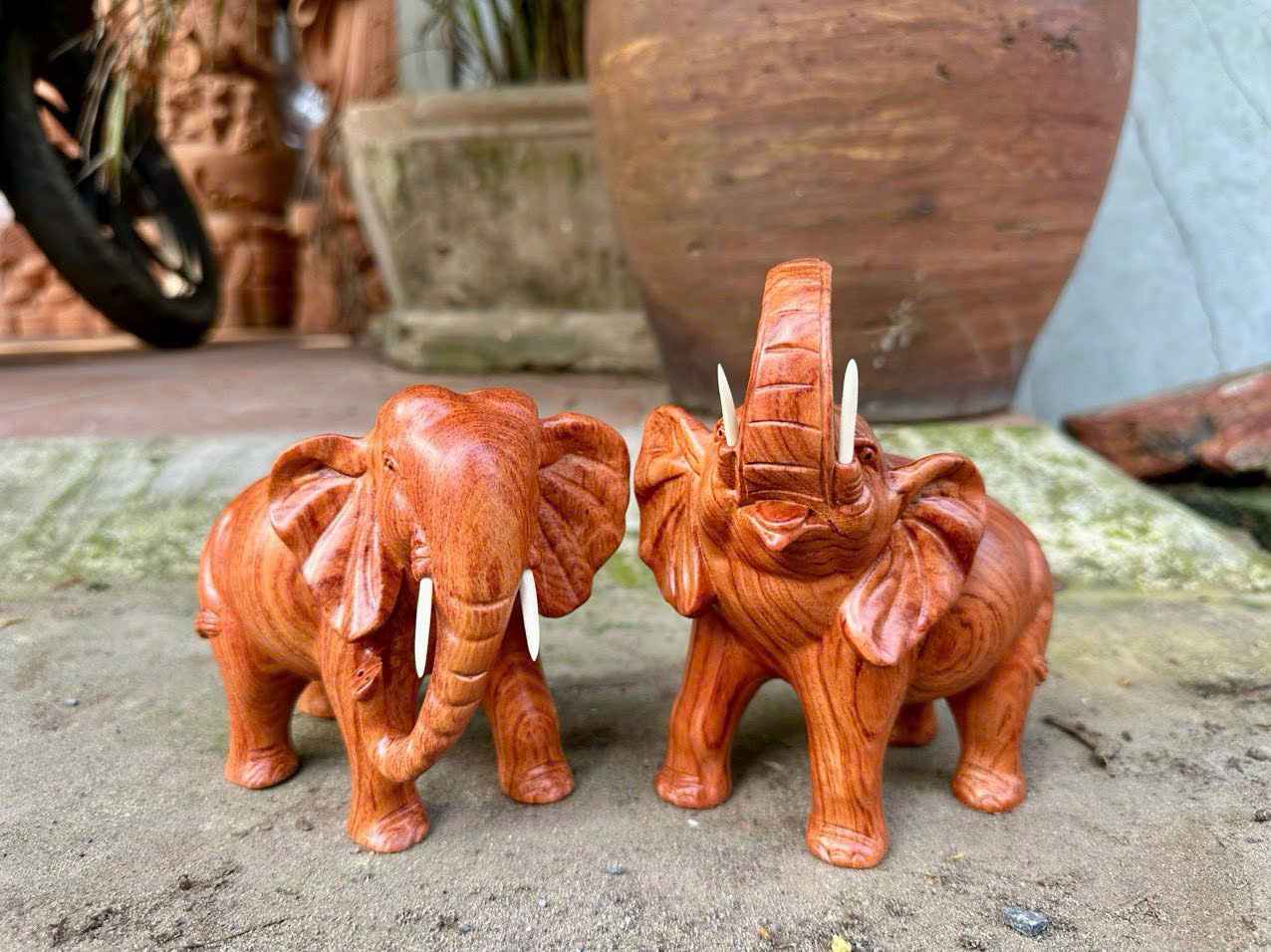 Tượng Cặp voi gỗ hương đá với dáng thế vững chãi, khỏe khoắn, tượng trưng cho sức mạnh, trí tuệ và sự bền vững lâu dài.