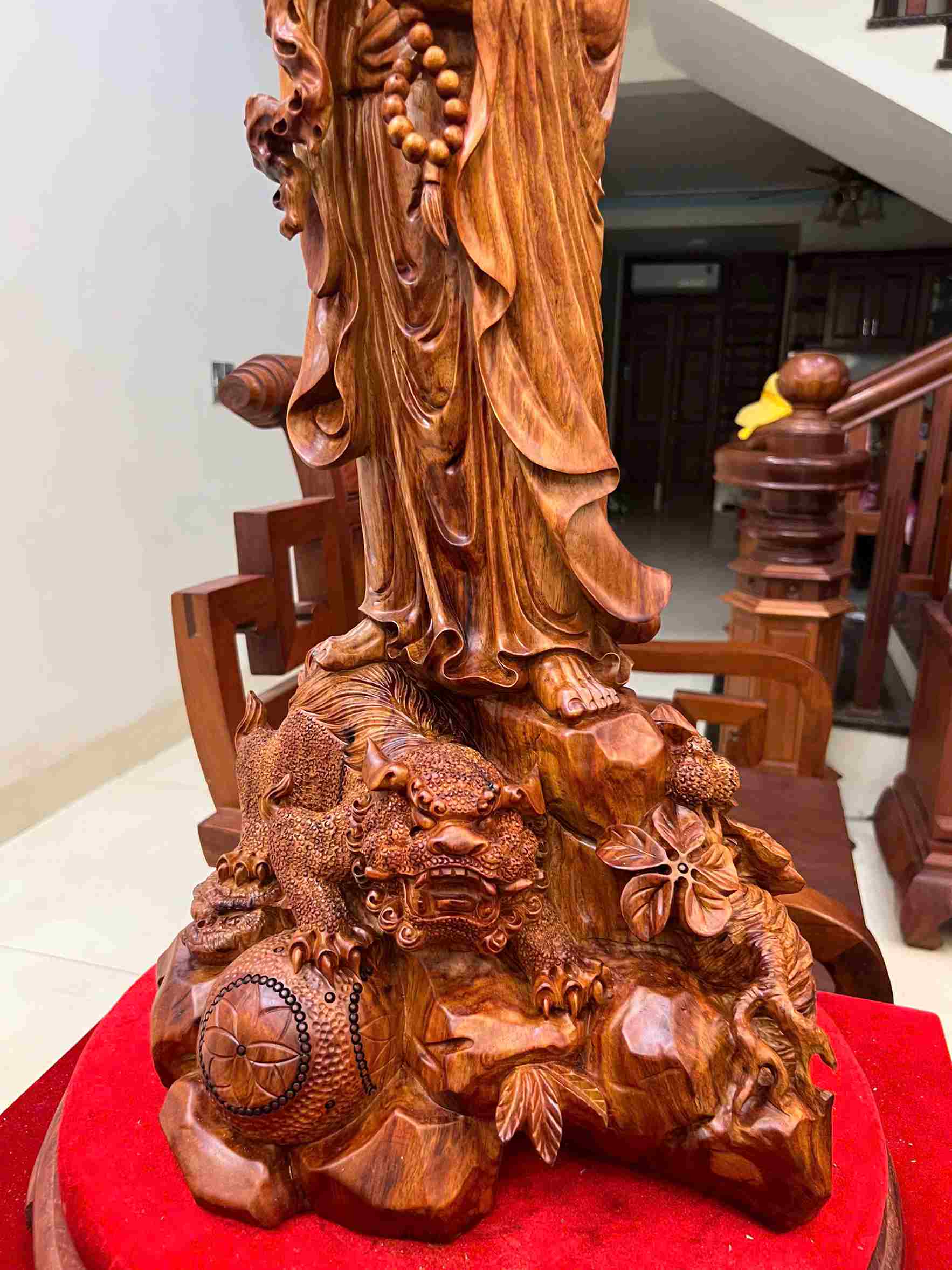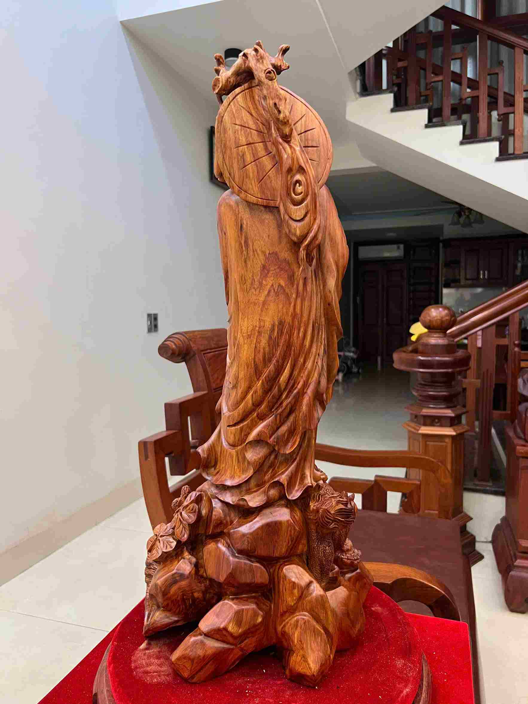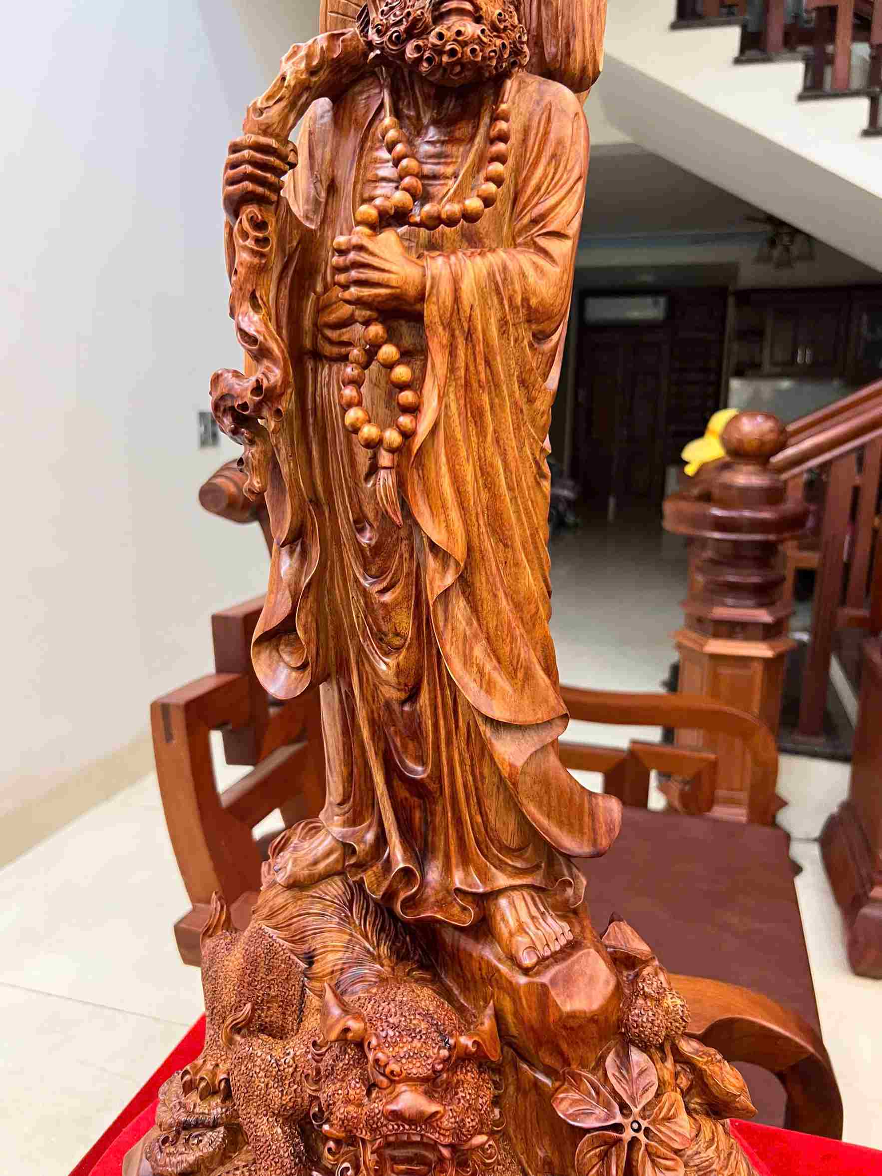 Chất liệu: Gỗ Sưa Bắc liền khối Kích thước: Cao 72 × Ngang 32 × Sâu 27 cm Hình tượng: Cụ Đạt Ma đứng Công dụng: Trấn trạch – Hóa giải sát khí – Tăng nội lực tinh thần