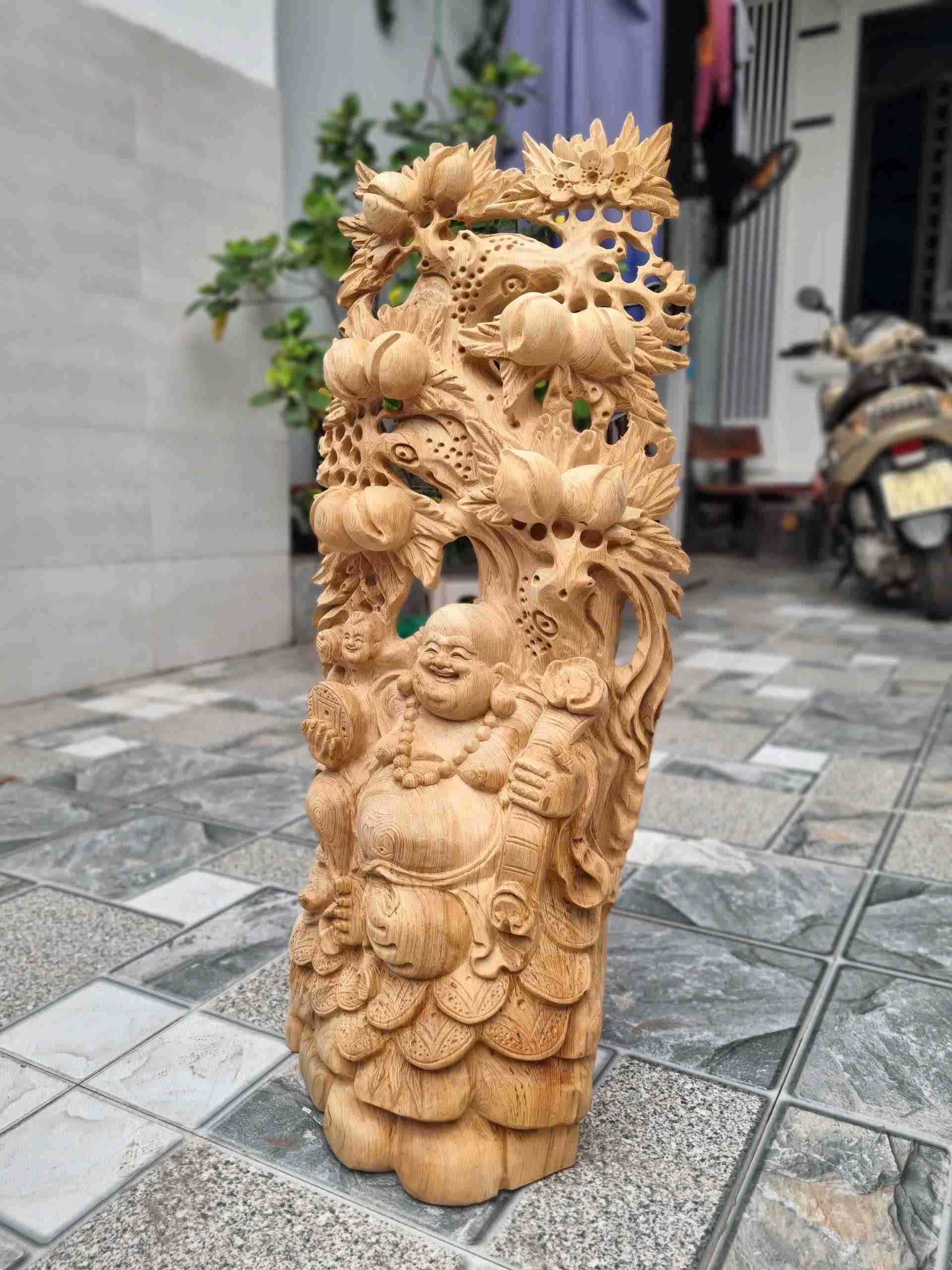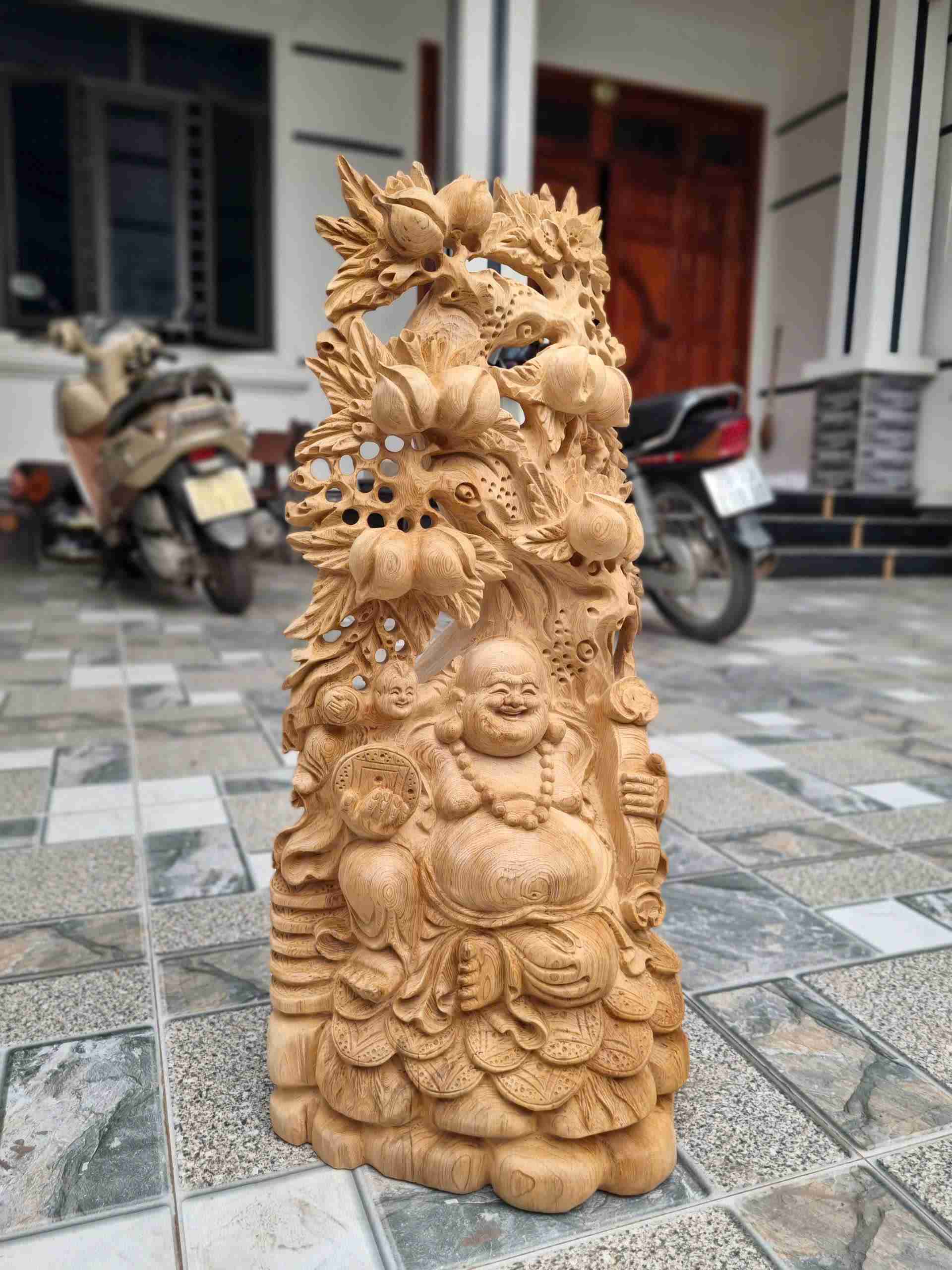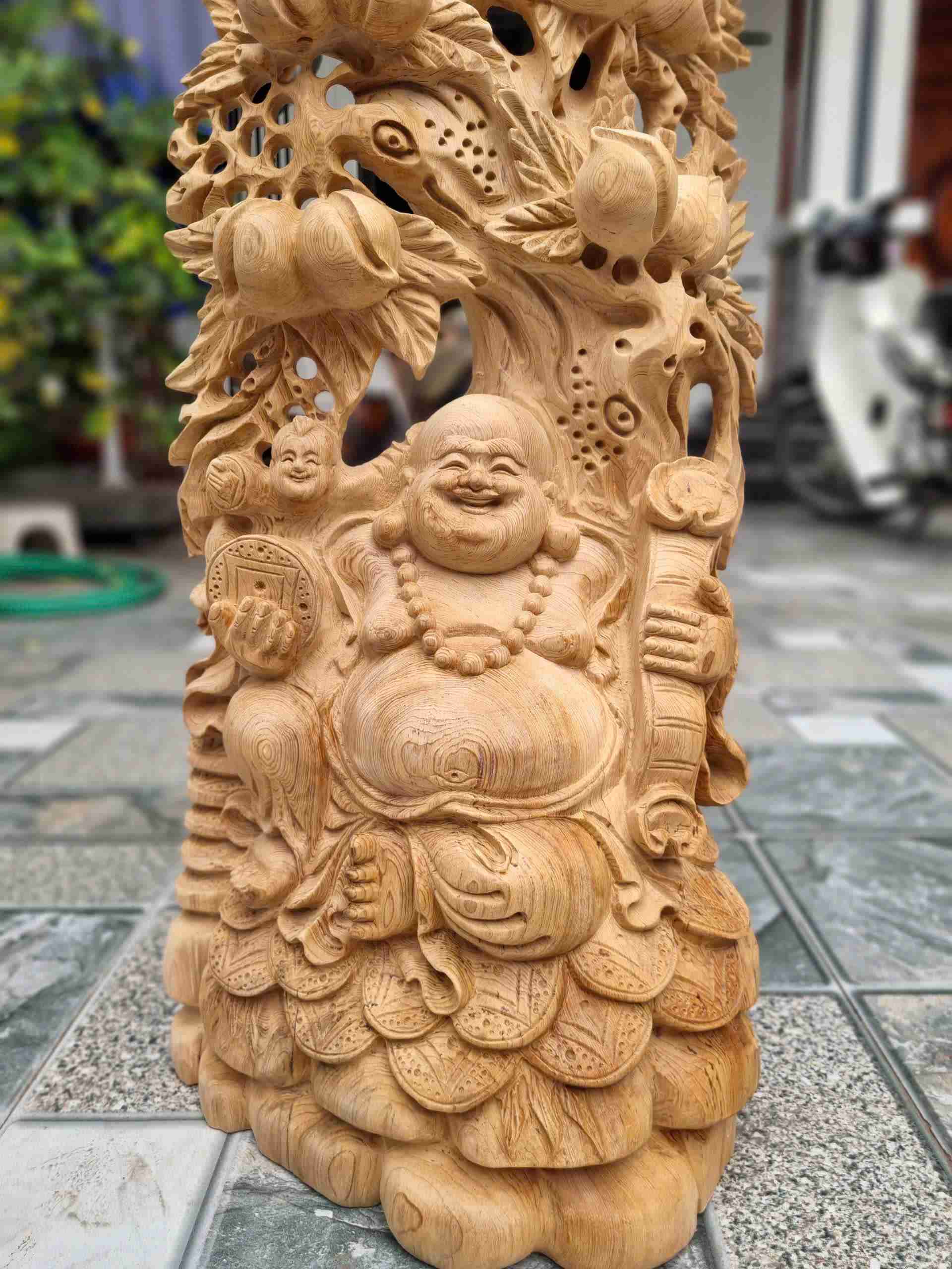 Tượng Di Lặc nhị phúc gỗ ngọc am với hình ảnh Di Lặc vui vẻ bên hai tiểu đồng, tượng trưng cho phúc khí nhân đôi, niềm vui và tài lộc song hành.