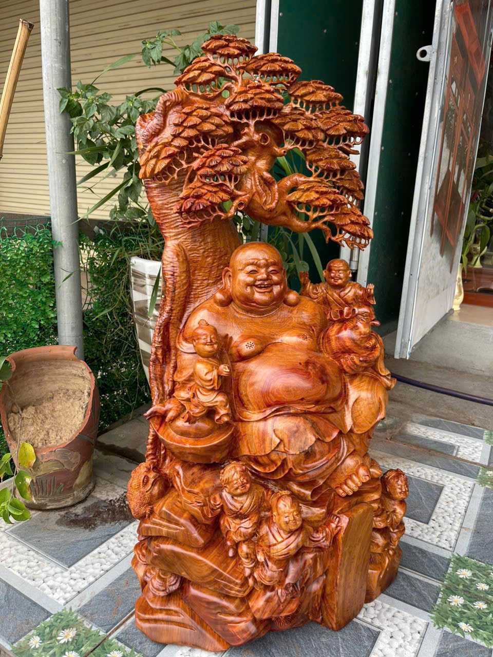 Chất liệu: Gỗ Hương tự nhiên Kích thước: Cao 90 cm, Ngang 48 cm, Sâu 30 cm Trọng lượng: 59 kg Hình tượng: Tượng Phật Di Lặc Ngũ Phúc Gốc Tùng phong thủy Công dụng: Trang trí, trưng bày phong thủy, chiêu tài lộc và bình an