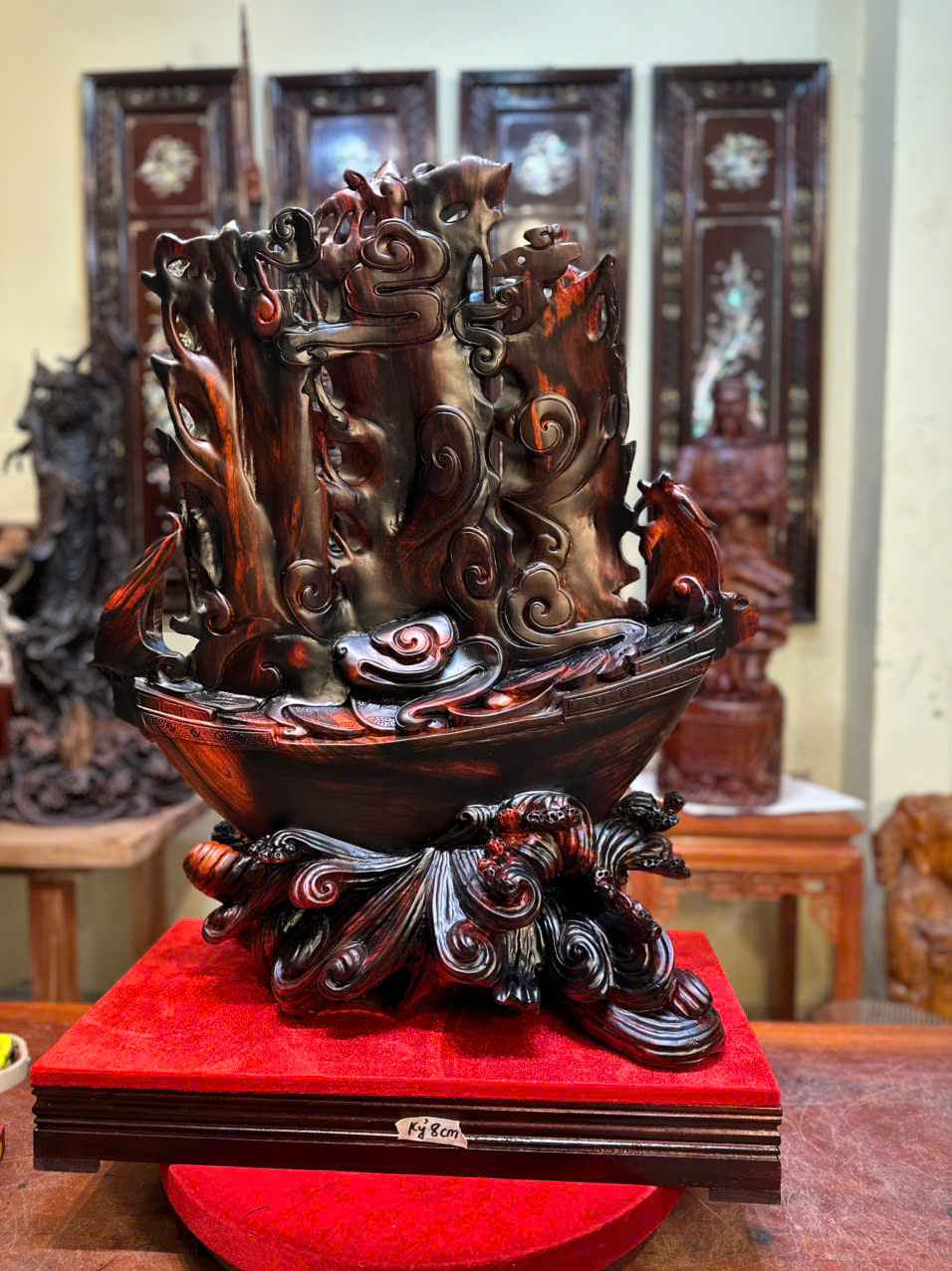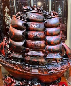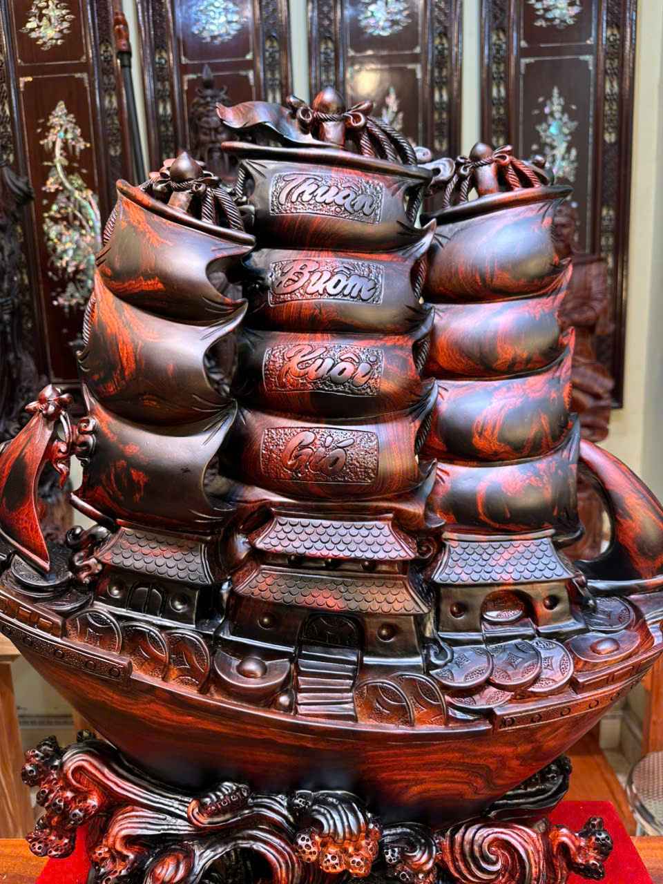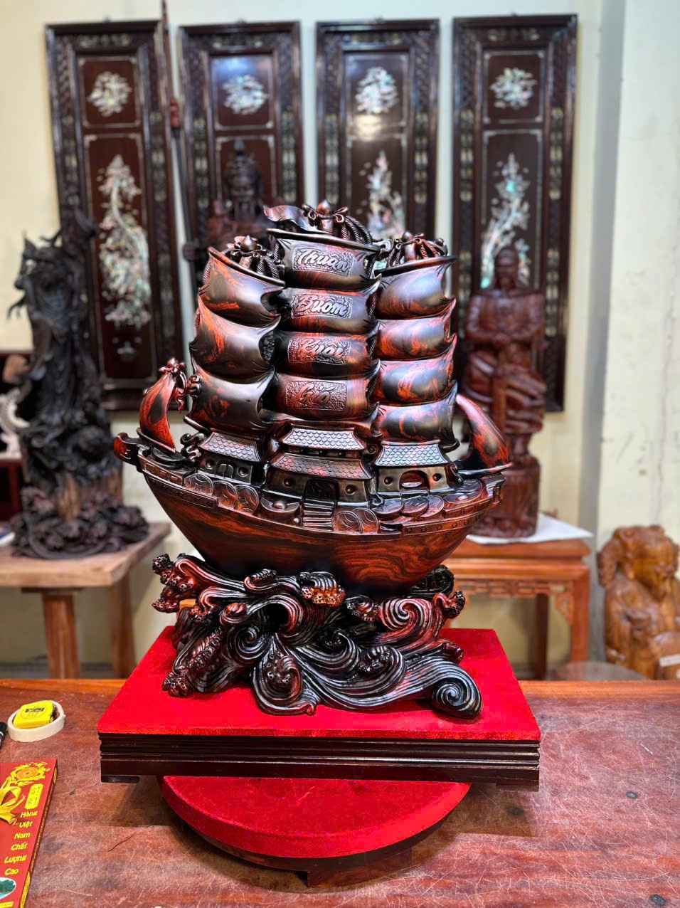 Tượng Thuận Buồm Xuôi Gió Gỗ Trắc được chế tác tinh xảo từ Gỗ Trắc Đen Đỏ già đanh, vân gỗ đẹp và chắc chắn. Hình tượng con thuyền căng buồm mang ý nghĩa thuận lợi, hanh thông trong công việc và cuộc sống. Sản phẩm phù hợp trưng bày phòng khách, bàn làm việc hoặc không gian kinh doanh, góp phần thu hút tài lộc và mang lại sự phát triển bền vững.